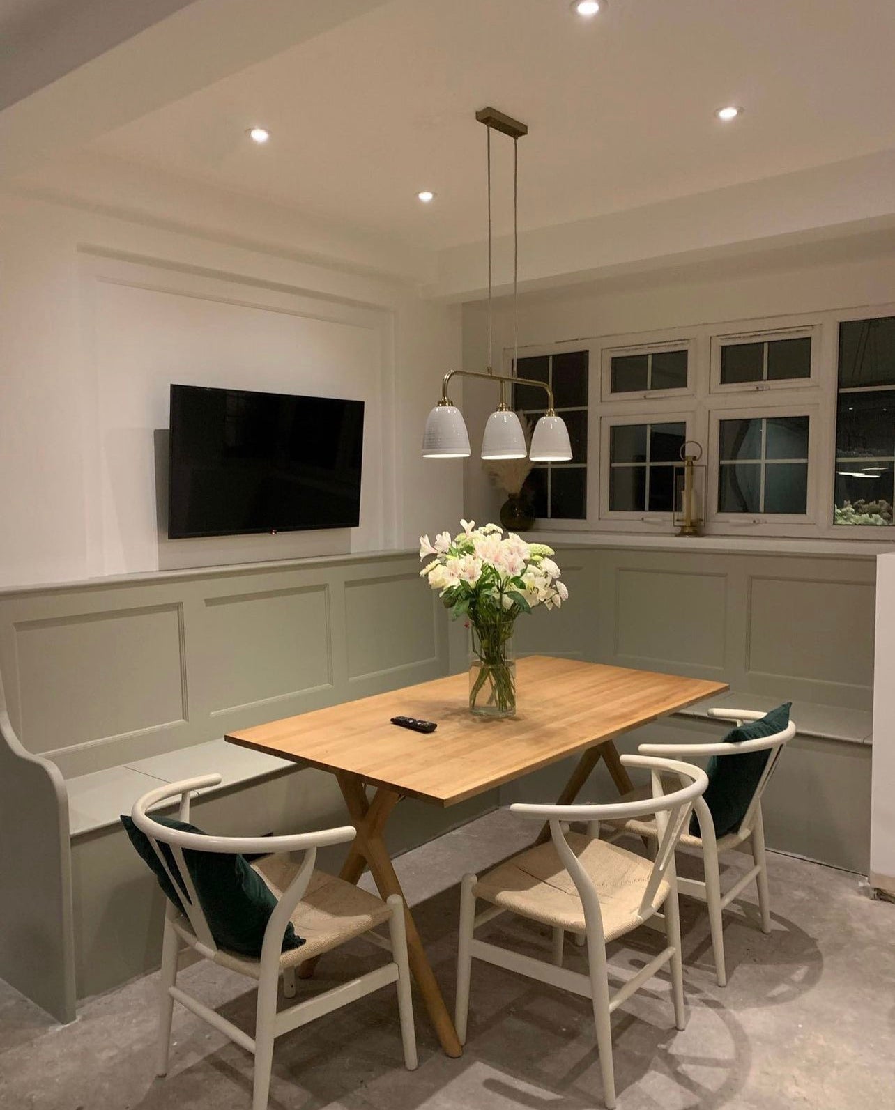 Bespoke Panelled seating area with built in electric sockets and storage hatches.